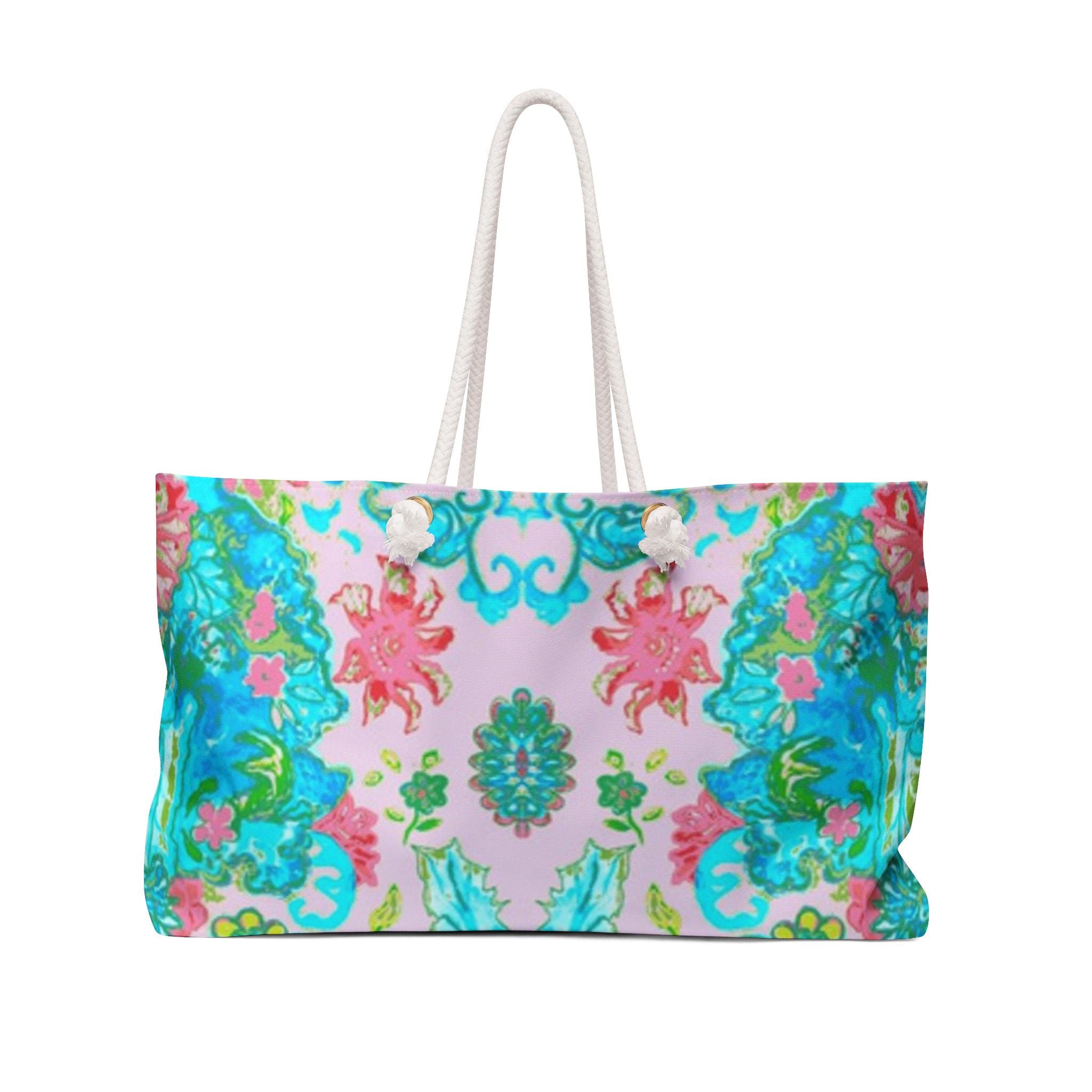 This roomy Weekender Bag brings a burst of retro joy to weekend escapes and city adventures. A playful, funky chick in a hippie-inspired print pops against vibrant colors, setting a carefree, far-out mood. The roomy T-bottom silhouette holds a weekend’s worth of clothes, a pair of shoes, and a book. Thick cream rope handles slip easily over the shoulder and feed through gold-toned grommets for a touch of vintage flair. Inside, a soft cream sheeting lining keeps contents cozy and makes packing simple. The spun polyester exterior resists wrinkles so the bold print stays bright and ready at a moment’s notice. Assembled in the USA with globally sourced parts, this bag feels handmade and ready for spontaneous road trips, festival weekends, or lazy beach mornings.