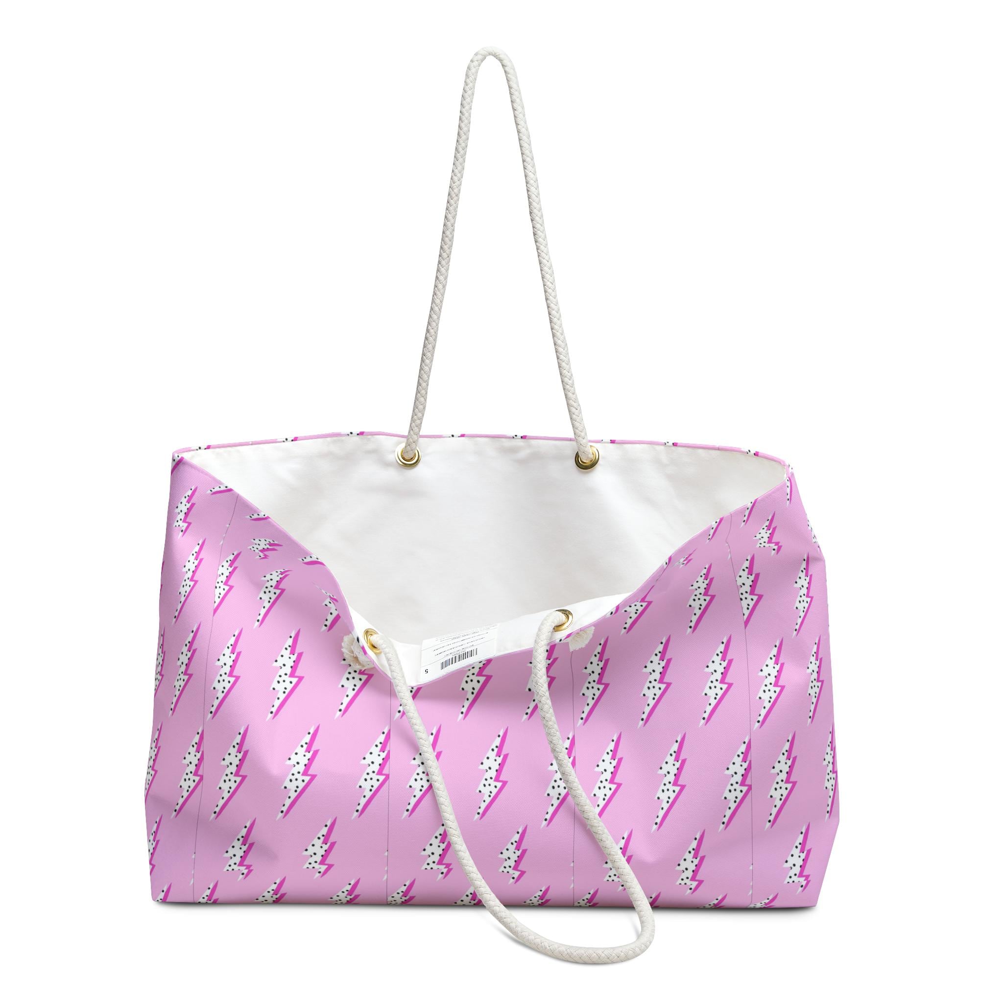 This roomy Weekender Bag glows with a playful neon-pink lighting bolt print that turns travel into an expression. It sits easily on a weekend escape or a city overnight, carrying clothes, a pair of shoes, and the little extras that make a trip feel like a break. The weight stays balanced on soft cream rope handles, and the roomy T-bottom keeps items upright and accessible. The spun polyester fabric keeps the bag smooth and low-maintenance; the cream sheeting interior adds a calm contrast so you can spot things quickly. It’s made with attention to detail — gold-toned grommets, neat stitching, and an assembly process completed in the USA — giving the bag a bright, lively look without fuss.