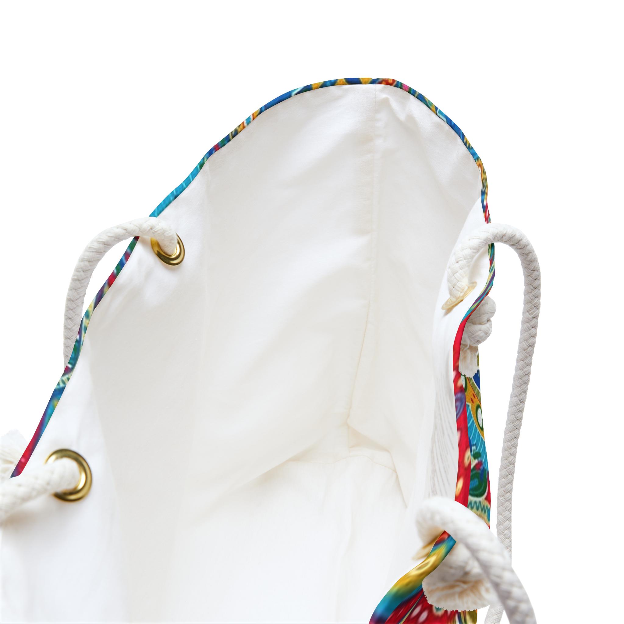 Bright, roomy, and ready for escape — this weekender bag carries summer energy in every stitch. The vibrant paisley-and-floral print pops against a turquoise background, bringing bohemian spice to beach mornings, farmers’ markets, or last-minute overnight plans. Soft cream rope handles sit comfortably on the shoulder while gold-tone grommets add a subtle, nautical glint. Inside, a cream sheeting lining keeps contents tidy and gives the bag a finished, durable feel. The structured T-bottom gives the bag stability when packed with towels, a sweater, or market finds, and the wrinkle-resistant spun polyester exterior keeps the print crisp trip after trip. Assembled in the USA from globally sourced parts, this bag feels personal and well-made — the kind you grab by habit when plans call for sun, movement, and color.