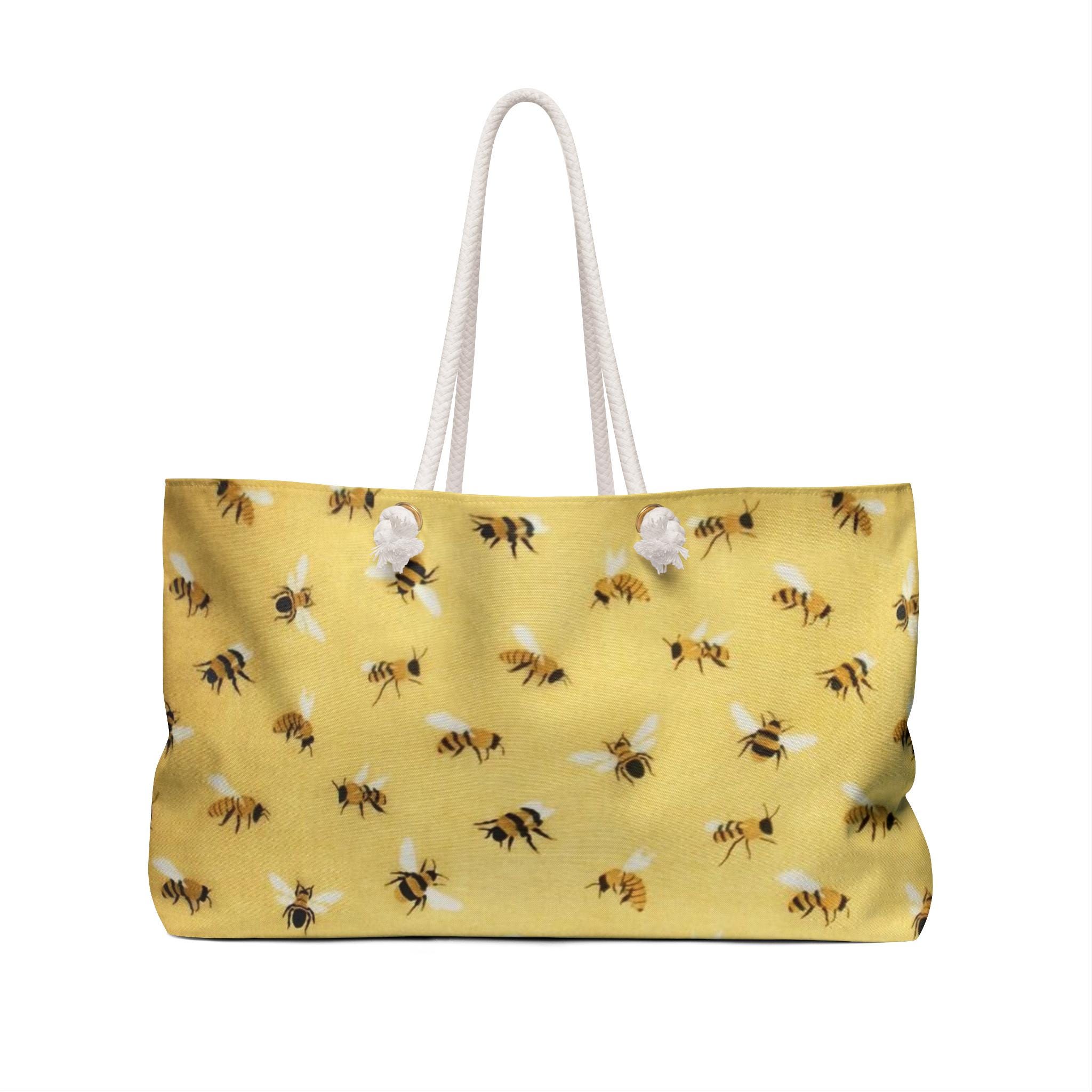 Our oversized Weekender Tote is perfect for your weekend at the beach or in town. The wide-mouthed, durable bag holds a generous amount of personal items and is easily held by its thick rope handles.\n.: 100% Spun Polyester Exterior\n.: One size: 24" x13" (60.9 cm x 33 cm)\n.: Cream sheeting interior lining (50% cotton, 50% polyester)\n.: T-bottom\n.: Assembled in the USA from globally sourced parts\n.: Please note: Size tolerance 0.75" (1.9 cm))